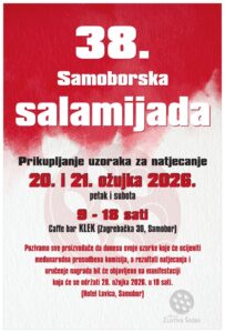 Samoborska Salamijada održat će se u subotu 28. ožujka 2026., s početkom u 19 sati, u hotelu Lavica, Samobor.